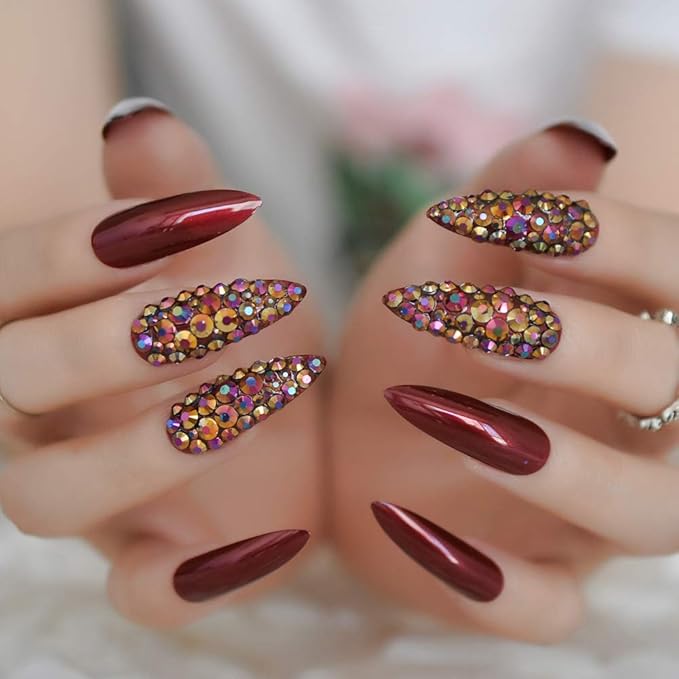 Amazon Com Coolnail 3d Shinning Rhinestones Matte Burgundy Stiletto Fake Nails Oval Almond Pointed Frosted Press On Designs False Wear Nail Beauty