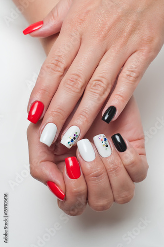 Bright Manicure Red Black And White On Square Long Nails With Crystals Stock Photo Adobe Stock